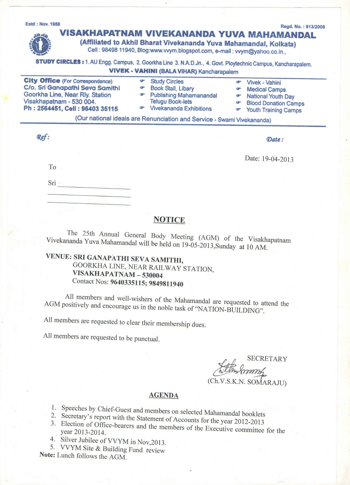 - Ratha Yatra was organised at Sri Haripuram Swamy Vivekananda Public School and Sarswathi Vidyamandir on 25.02.2013.(Meetings conducted) Ratham kept at Old Gajuwaka Jn.(5 p.m. To 7 p.m.).Sri PL Narasimharao coordinated.